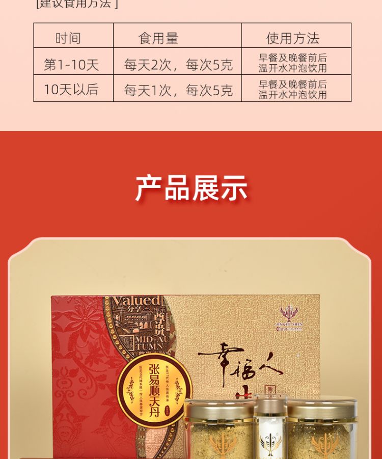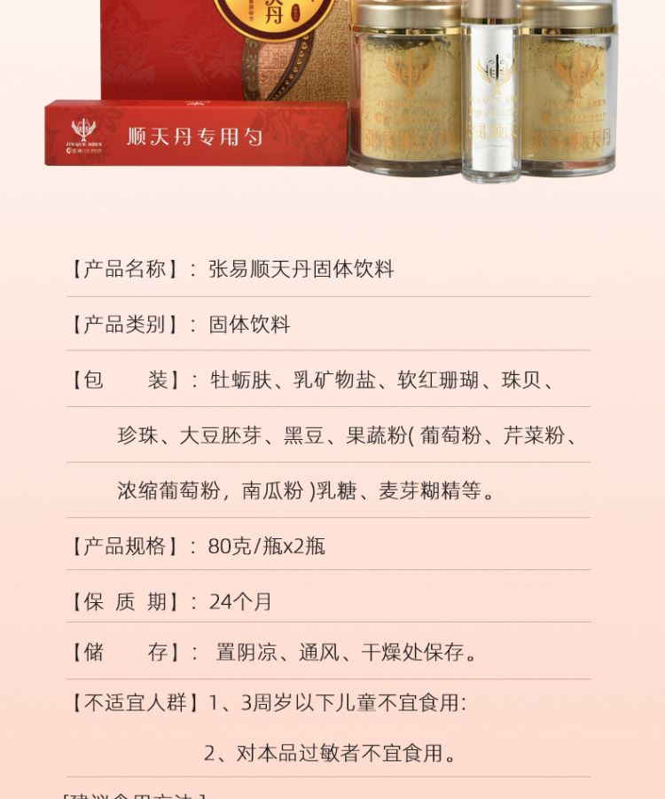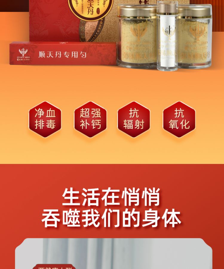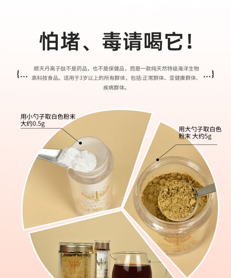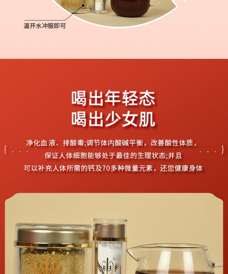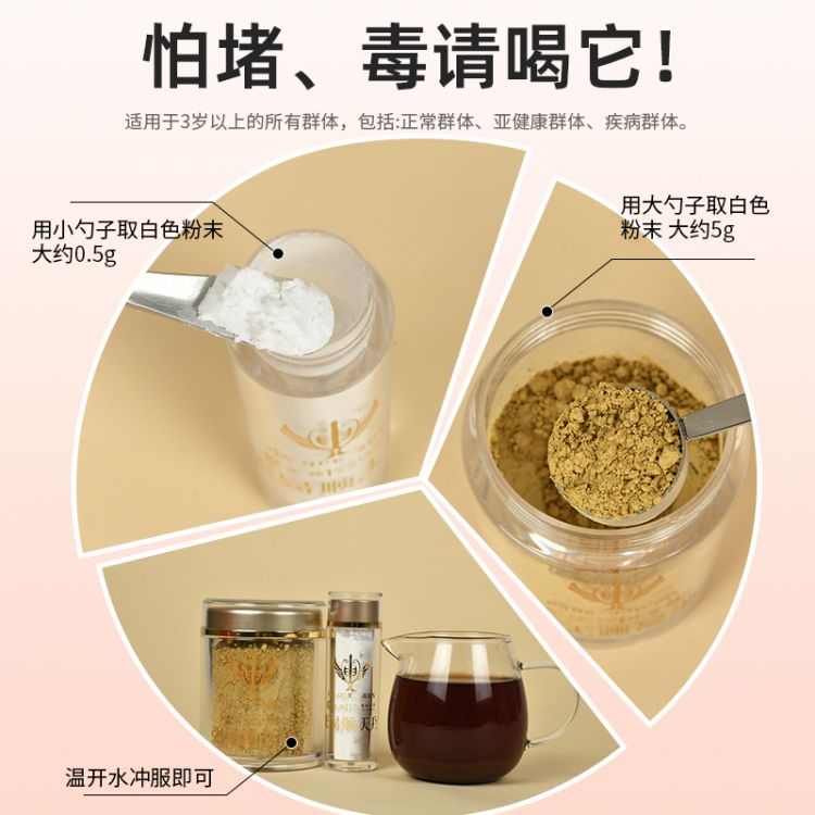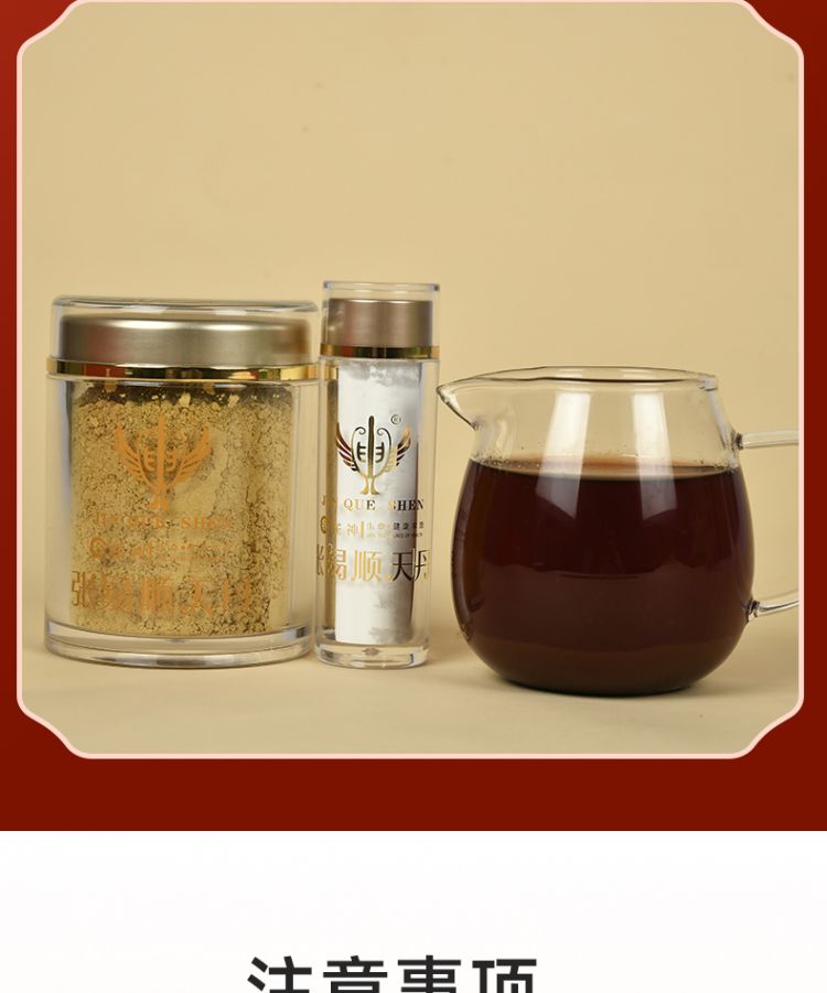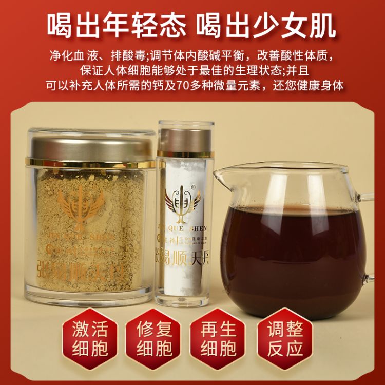 产品特点:医圣仲景家传秘方,经56代嫡系唯一传人张泰源制作而成,出世30余年,风靡全球120多个国家。其工艺是采集深海特殊药材,利用超高温崔化技术将其分解,再用转基霉将特殊成份吸附成为白色粉沫,其中含70余种离子钛,在服用的过程中,慢慢改变人的体质,从而让一切重症没有发生的因素。每个人的健康状态不一样,服食的时候味道也不一样,其有九种味道,可以检测身体的属性。